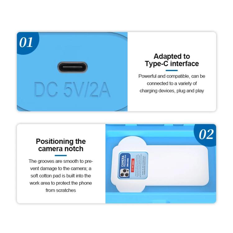 7. Posizionamento del design della tacca della fotocamera, liscia per prevenire danni alla fotocamera, l’area di lavoro incorpora morbidi cuscinetti di cotone per proteggere il telefono per evitare graffi