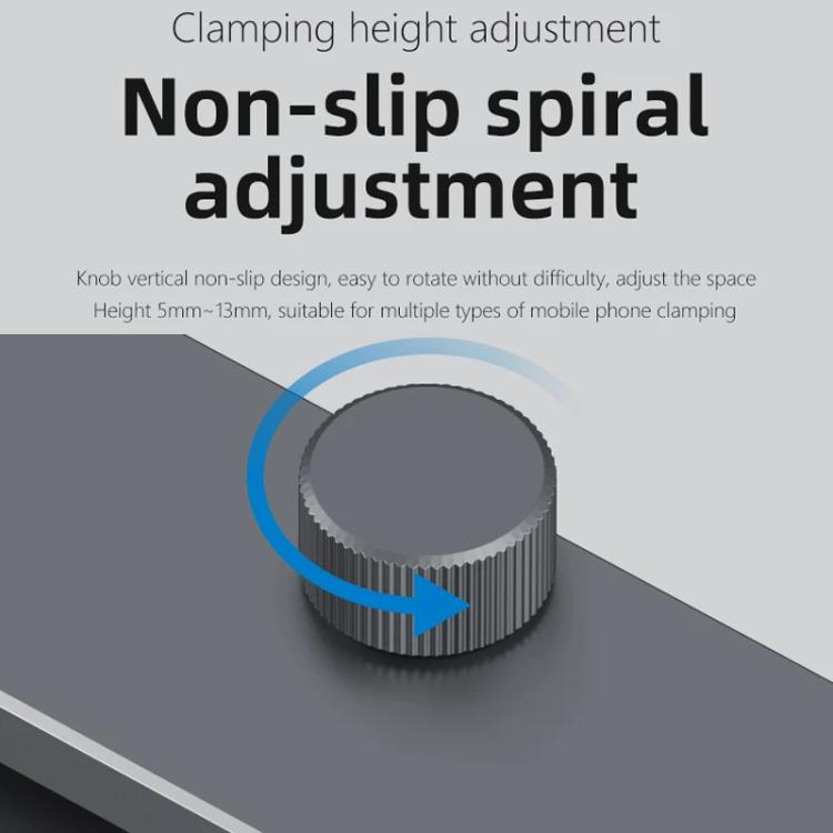 2. La manopola ha un design antiscivolo verticale, che ne facilita la rotazione, l’altezza dello spazio regolabile è di circa 5-13 mm, adatta per il serraggio di più modelli di telefoni cellulari