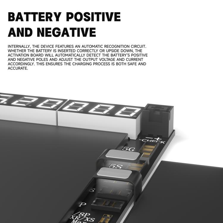 5. Internamente, il dispositivo è dotato di un circuito di riconoscimento automatico, indipendentemente dal fatto che la batteria sia inserita correttamente o capovolta, la scheda di attivazione rileverà automaticamente i poli positivo e negativo della batteria e regolerà di conseguenza la tensione e la corrente di uscita, questo garantisce che il processo di carica sia sicuro e preciso