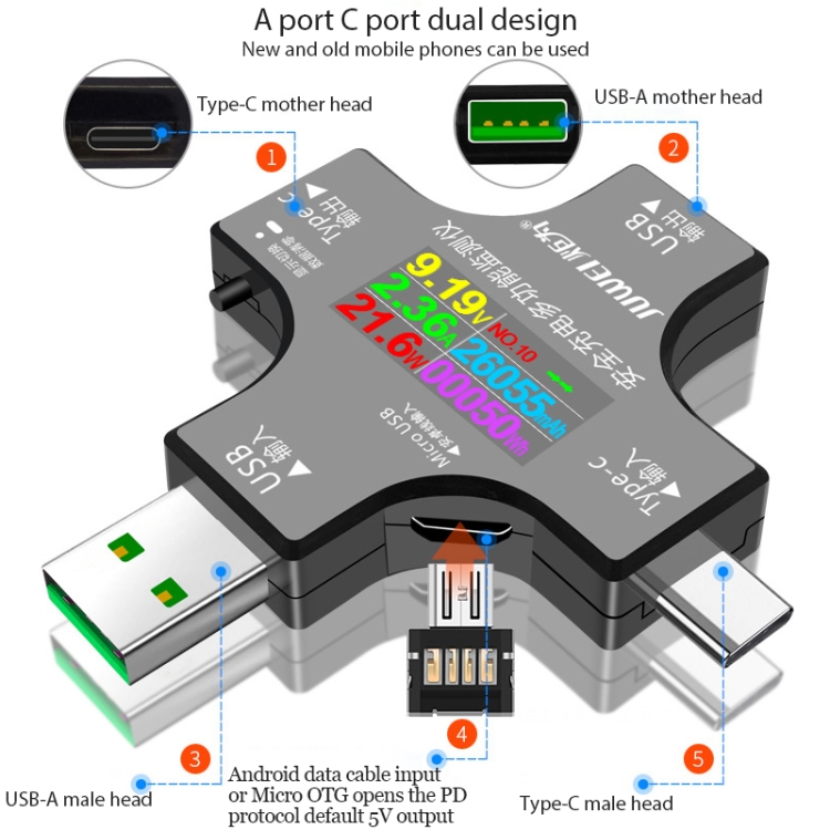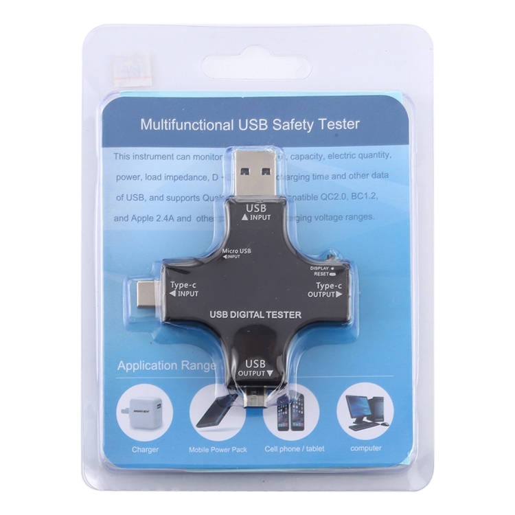 1. Questo strumento può monitorare tensione, corrente, capacità, quantità elettrica, potenza, impedenza di carico, tensione D + / D-, tempo di ricarica e altri dati dell’USB